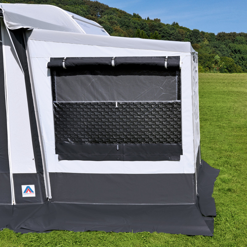 Dodatek do markizy podróżnej Meira jest podłączany do markizy za pomocą podwójnego profilu rurkowego. Posiada przyciemniane przednie okno oraz boczne wejście, które można zwinąć. Słupki: stalowe o średnicy 25 mm, w zestawie centralna rozpórka dachowa i nogi z pętlami.