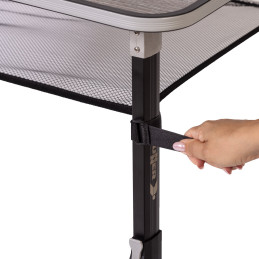 Podobnie jak Elútop ComPack, model ComPack NG wyróżnia się ultralekkim, składanym blatem, wysoką stabilnością i oszczędnością miejsca. Dodatkowo jest trwały, odporny na warunki atmosferyczne i łatwy w transporcie. Nowością są praktyczna półka siatkowa oraz profile nóg stołu z precyzyjną, bezstopniową regulacją.