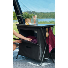 Poręczne, łatwe w montażu szafki z zewnętrzną aluminiową ramą, które zachwycają doskonałą stabilnością. Solidne, składane drzwi z uchwytem zapewniają prostą i cichą przestrzeń do przechowywania, jak w domu. Magnesy w drzwiach umożliwiają ich łatwe otwieranie i zamykanie. W zestawie znajduje się torba do przenoszenia i przechowywania. Szafki kempingowe Domingo i Aruba można uzupełnić organizerem (nr art. 72 138). Wszystkie wersje mają udźwig do 30 kg.