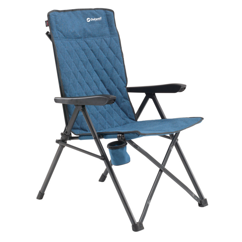 Składane krzesło z trzema pozycjami oparcia i miękko wyściełanym pokrowcem idealnie nadaje się do jedzenia i relaksu. Zagłówek sprawia, że krzesło jest jeszcze wygodniejsze. Poręczny uchwyt na napój można złożyć po użyciu. Krzesło można łatwo złożyć i rozłożyć. W zestawie torba transportowa.
