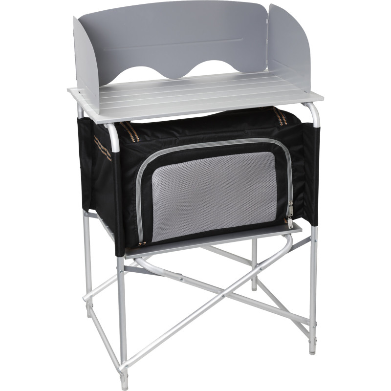 Szafka kuchenna Frankana Freiko HighQ AC-094 V3 z żaroodpornym, składanym blatem i aluminiową osłoną przeciwwiatrową idealnie organizuje przestrzeń w kamperze. Dwie przestronne przegródki z regulowanymi półkami pomieszczą jedzenie i naczynia (nośność 30 kg). Wymiary rozłożone: 81 x 87 x 55,5 cm, waga 10,5 kg – lekka i łatwa do transportu.