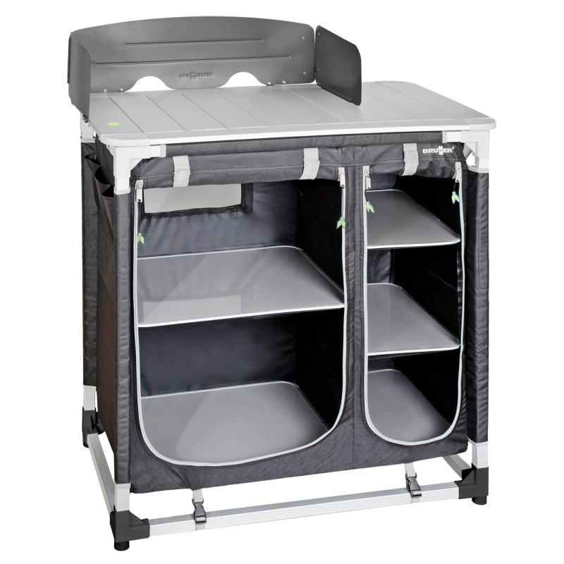 Wielofunkcyjna szafka kempingowa ma zewnętrzną ramę CROSS z aluminium, która montuje się wyjątkowo szybko, oraz solidne pokrycie z wytrzymałego poliestru. Z tyłu wszyto siatkę wentylacyjną z gazy, a regulowane, obrotowe nóżki gwarantują stabilne ustawienie nawet na miękkim podłożu. W zestawie znajduje się torba transportowa.