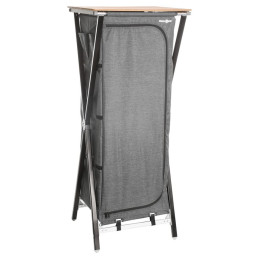 Wielofunkcyjna szafka kempingowa ma zewnętrzną ramę CROSS z aluminium, która montuje się wyjątkowo szybko, oraz solidne pokrycie z wytrzymałego poliestru. Z tyłu wszyto siatkę wentylacyjną z gazy, a regulowane, obrotowe nóżki gwarantują stabilne ustawienie nawet na miękkim podłożu. W zestawie znajduje się torba transportowa.