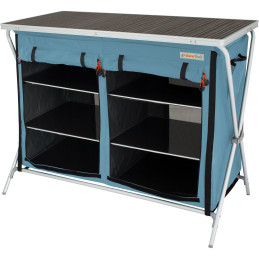 Te szafki kempingowe do przechowywania są dostępne w 2 nowoczesnych pastelowych kolorach i 2 rozmiarach, a czarne paski mocujące tworzą efektowny kontrast z jasnym poszyciem, w które z tyłu wbudowano moskitierę dla lepszej wentylacji. Stabilny blat i półki wzmocnione aluminium zapewniają trwałość, regulowane nóżki podporowe ułatwiają ustawienie na nierównym podłożu, a w zestawie znajduje się torba transportowa.