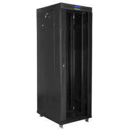 Szafa RACK 19” 37U 600x800 Lanberg FF01-6837-12BL V2 to solidna obudowa stalowa z drzwiami szklanymi (z zamkiem, montaż lewo/prawo), tylnymi stalowymi i zdejmowanymi bocznymi panelami. Wyposażona w regulowane szyny montażowe, cyfrowy termostat z wyświetlaczem LCD, panel wentylacyjny z 2 wentylatorami 230 V oraz przepusty kablowe z zaślepkami.