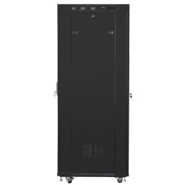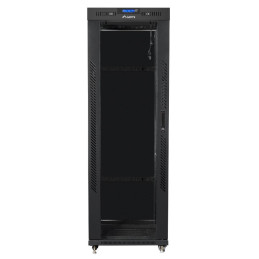 Szafa RACK 19” 22U 600x600 Lanberg FF01-6622-12BL V2 to solidna obudowa stalowa z drzwiami szklanymi (z zamkiem, montaż lewo/prawo), tylnymi stalowymi i zdejmowanymi bocznymi panelami. Wyposażona w regulowane szyny montażowe, cyfrowy termostat z wyświetlaczem LCD, panel wentylacyjny z 2 wentylatorami 230 V oraz przepusty kablowe z zaślepkami.