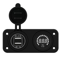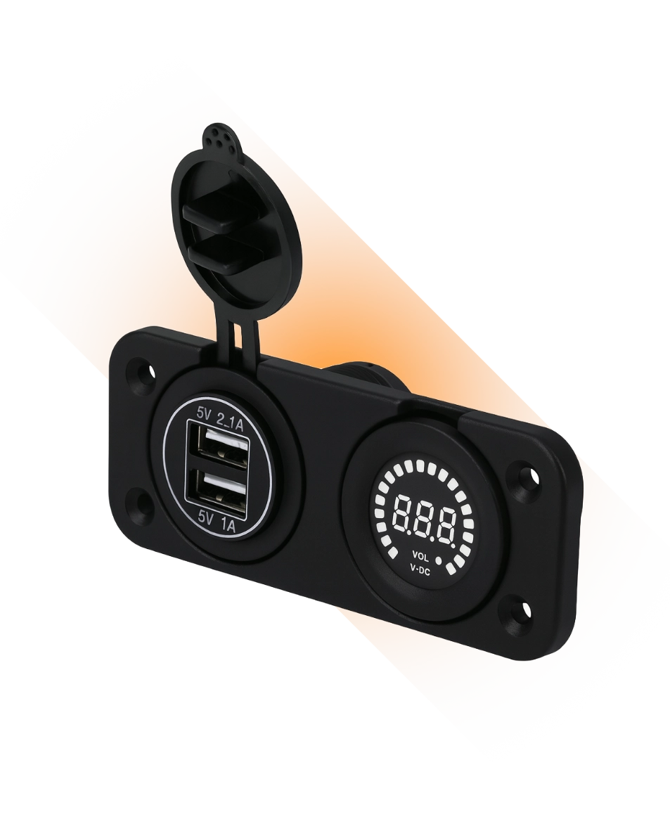 Kompaktowa, wodoodporna ładowarka z woltomierzem LED oraz dwoma portami USB. Dedykowana do pojazdów samochodowych, łodzi, ATV, UTV, RV i instalacji morskich, umożliwiająca szybkie ładowanie dwóch urządzeń jednocześnie (np. smartfonów, tabletów czy GPS).