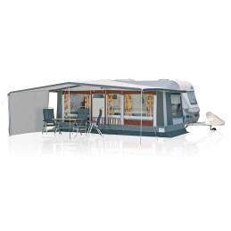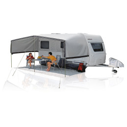 Zadaszenie przeciwsłoneczne może być używane z boczną ścianką po prawej lub lewej stronie. Wybierając rozmiar, decydujesz, jak duża ma być ochrona przed słońcem lub pogodą. Zadaszenie jest lekkie i ma mały rozmiar po złożeniu. Może być wciągnięte w szynę rurkową przyczepy kempingowej. Można je również zamontować na namiocie markizowym za pomocą oczek dzięki wszytemu paskowi wzmacniającemu przed szyną rurkową. Wystarczy włożyć oczka w pasek.