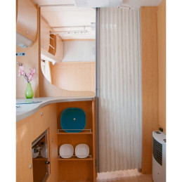 Przegroda pokojowa REMIform sprawia, że przyczepy kempingowe lub kampery stają się jeszcze bardziej przytulne. Naturalne oddzielenie często otwartej przestrzeni tworzy ciepłą, intymną atmosferę. Idealne, gdy przestrzeń jest ograniczona. Lekka i cicha w obsłudze. Można ją przyciąć i dopasować indywidualnie, elastycznie i łatwo. Plisy, listwa uchwytowa i szyna prowadząca w kolorze kremowym (RAL 9001).