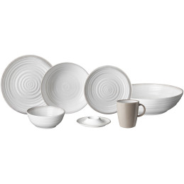 Zestaw stołowy Bellagio marki Brunner to 16 elementów z trwałej melaminy w szarym kolorze z białymi akcentami – idealny na kemping. Zawiera 4 talerze obiadowe Ø26 cm, 4 do zupy i deserowe Ø21 cm oraz 4 kubki 0,3 l. Lekki (3,8 kg) i praktyczny, zapewni komfortowe posiłki w plenerze.