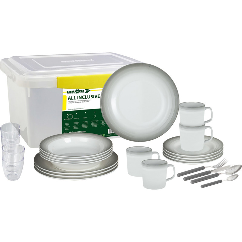 Zestaw stołowy Bellagio marki Brunner to 16 elementów z trwałej melaminy w szarym kolorze z białymi akcentami – idealny na kemping. Zawiera 4 talerze obiadowe Ø26 cm, 4 do zupy i deserowe Ø21 cm oraz 4 kubki 0,3 l. Lekki (3,8 kg) i praktyczny, zapewni komfortowe posiłki w plenerze.